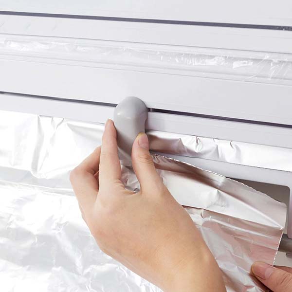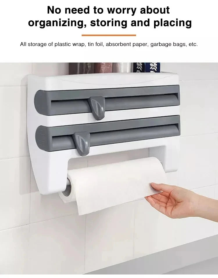 Zaboravite na nered u kuhinji! Ovaj multifunkcionalni držač raspolaže sa tri praktična odeljka – za alu foliju, prijanjajuću (plastičnu) foliju i kuhinjski ubrus.