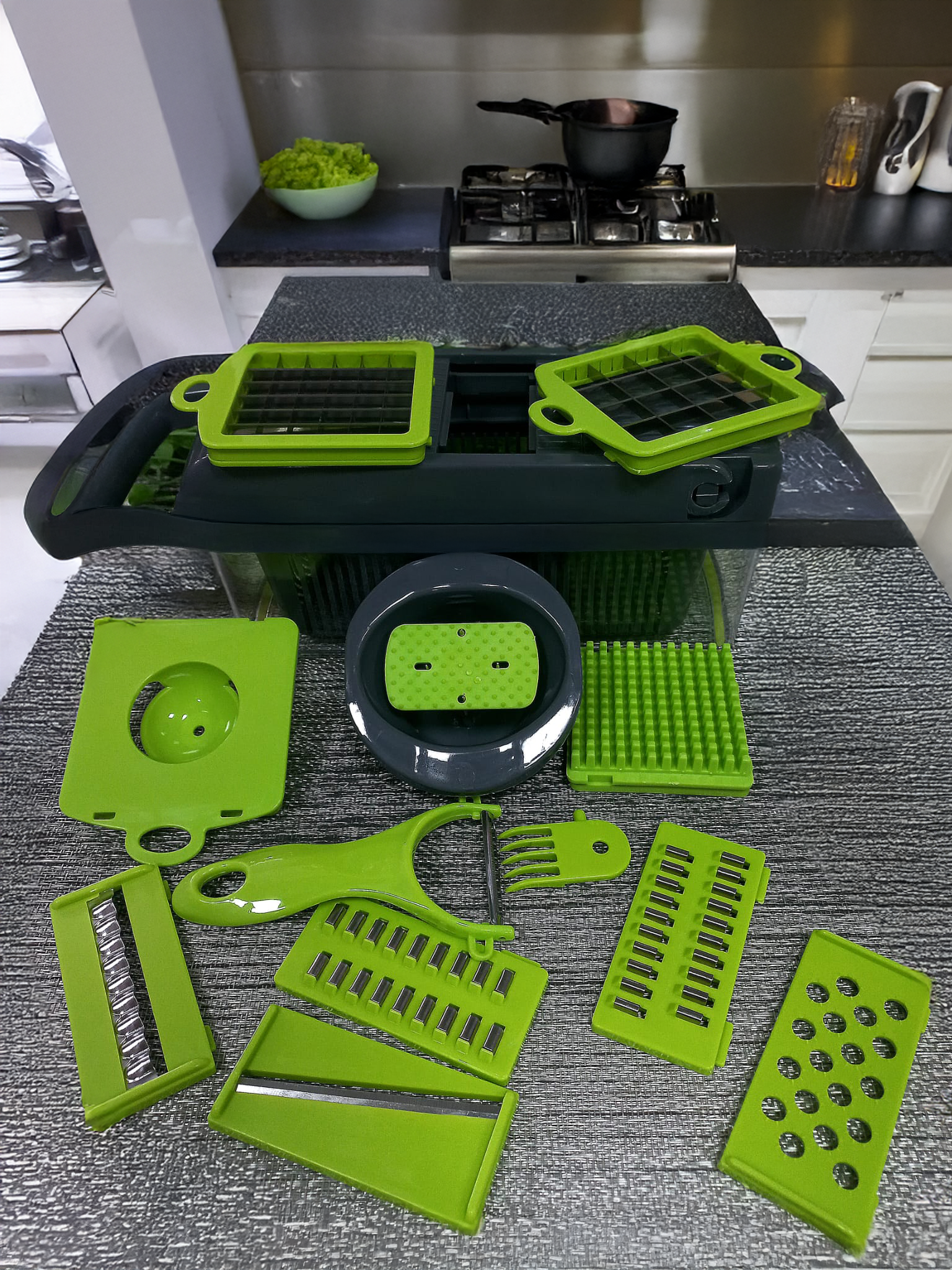 Set uključuje: plastičnu bazu, 6 različitih nastavaka za sečenje i rendanje, posudu za čuvanje hrane, plastičnu ljuštilicu i držač